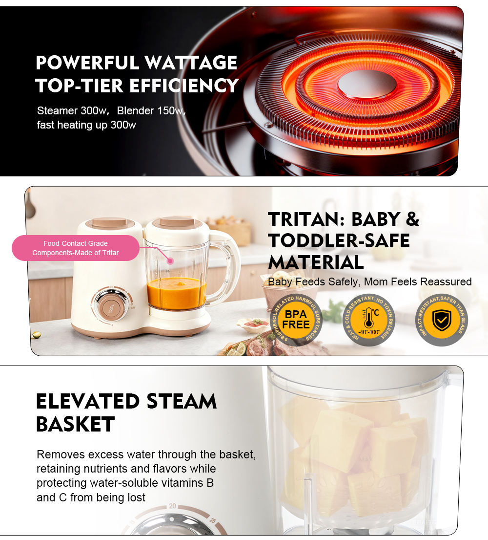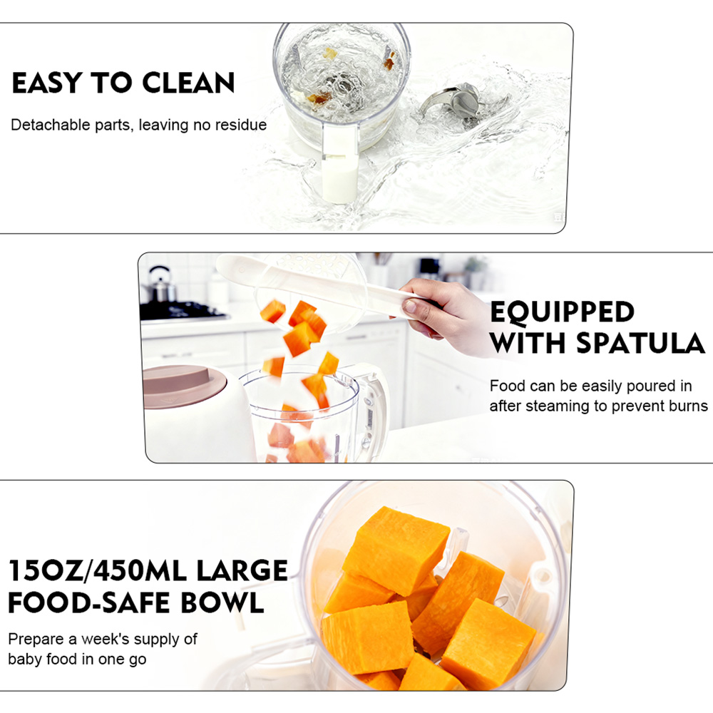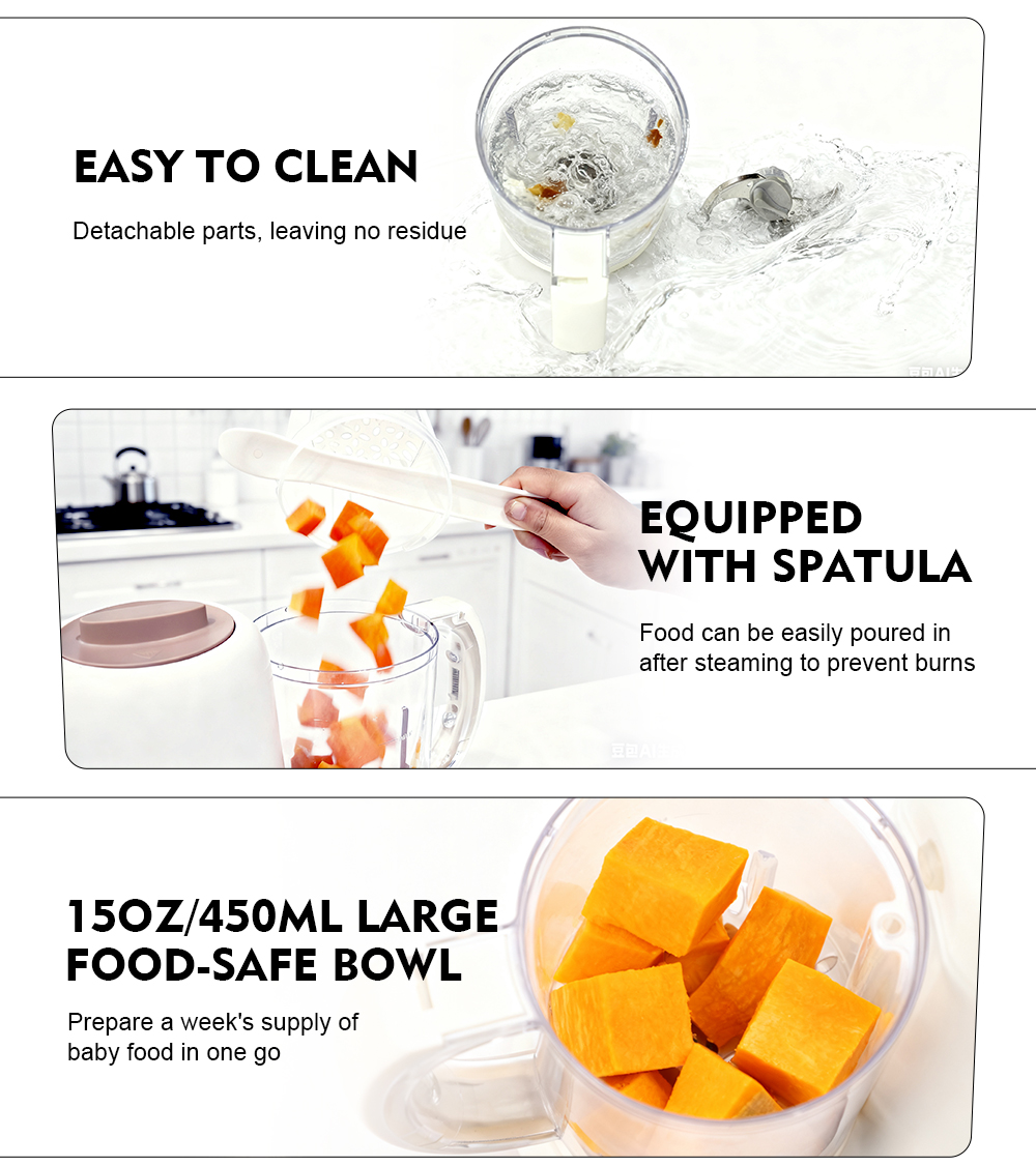 ●BPA free and food grade material. All parts of the baby food maker are dishwasher safe except for the motor and housing.