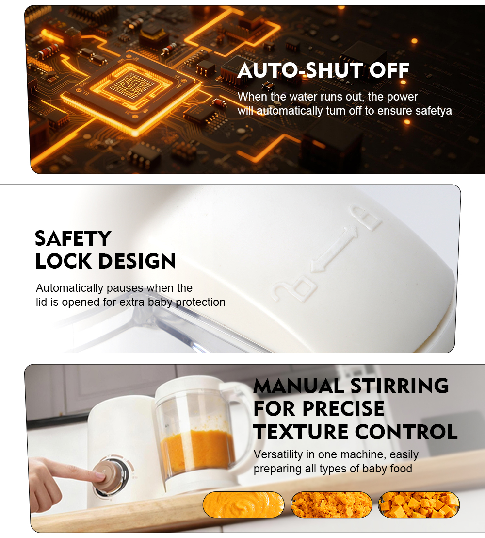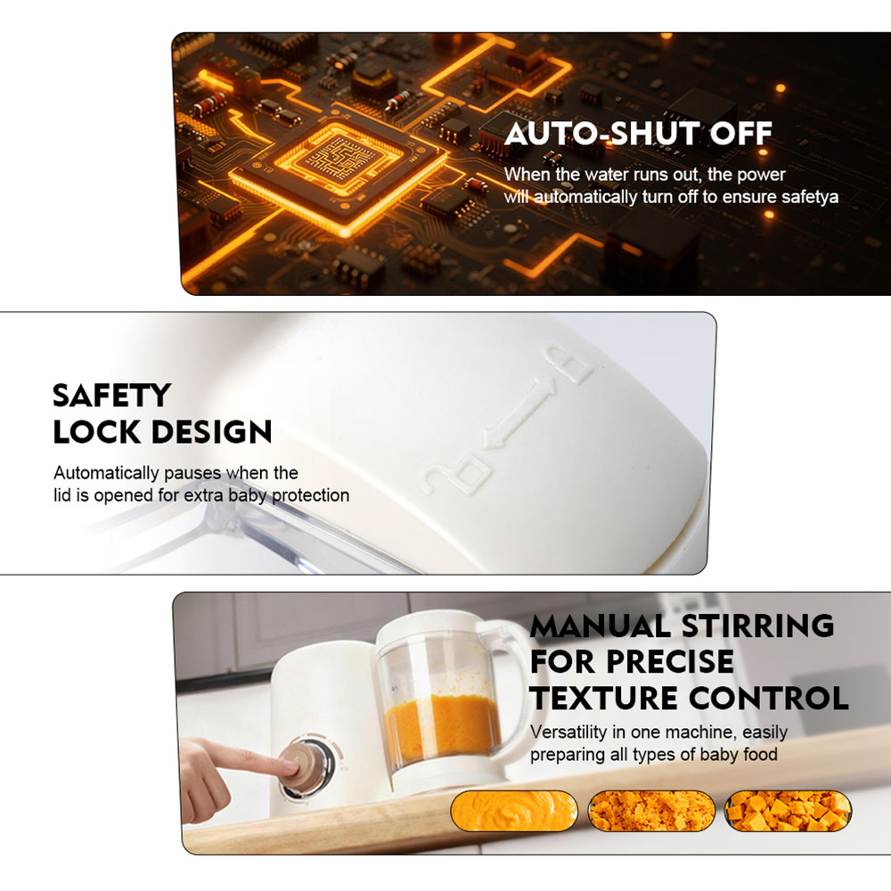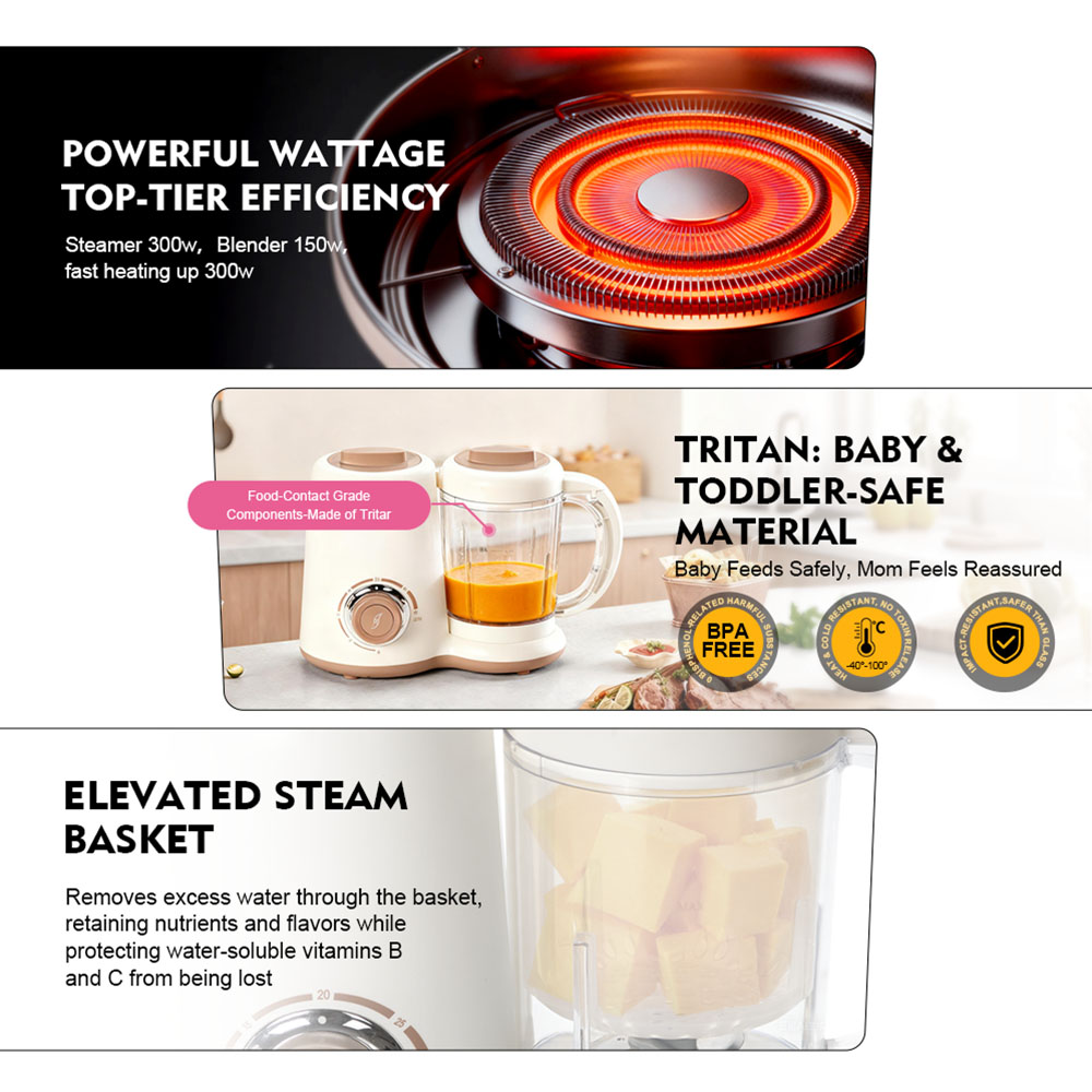 ●BPA free and food grade material. All parts of the baby food maker are dishwasher safe except for the motor and housing.