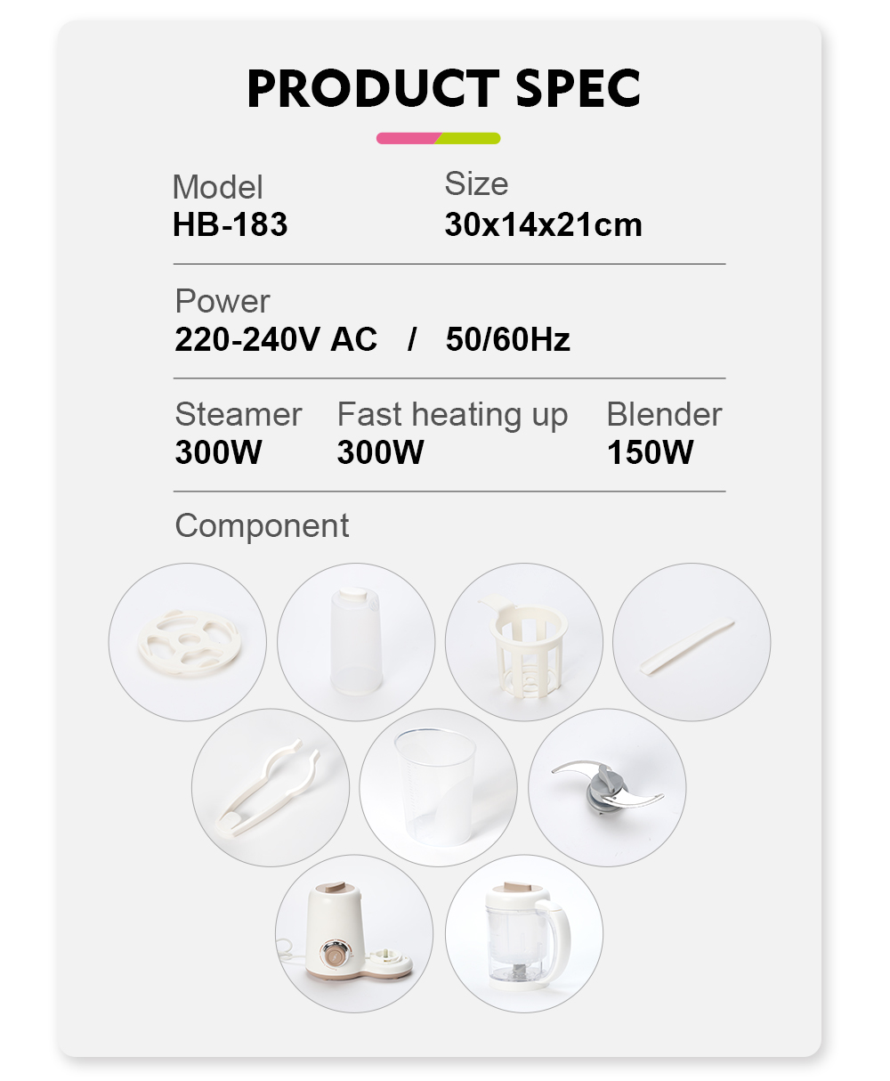 | HB-183 | 220-240V AC 50/60Hz | Steamer: 300W, fast heating up: 300w, blender: 150W | 30*14*21CM | Steams, heats up, blends |